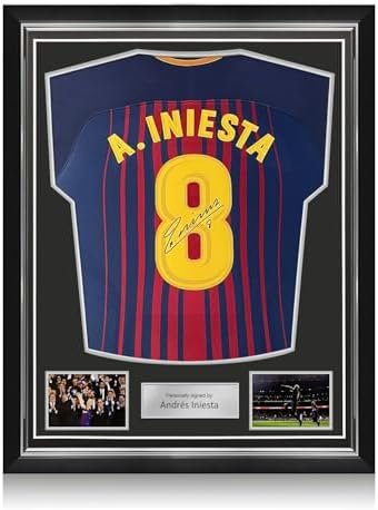 Official Authentic Issue 2017-18 Barcelona home shirt, fan style printing, signed by Andres Iniesta. In superior black frame with silver inlay. Approximate size: 840 x 670 mm / 33 x 26.5 inches