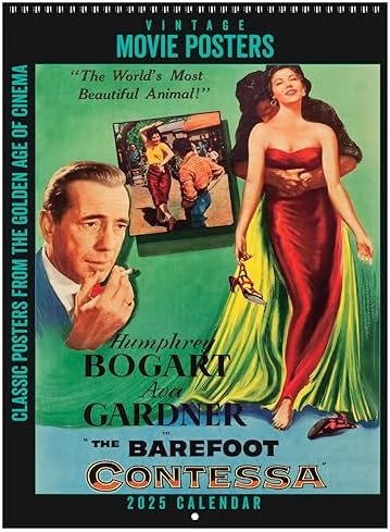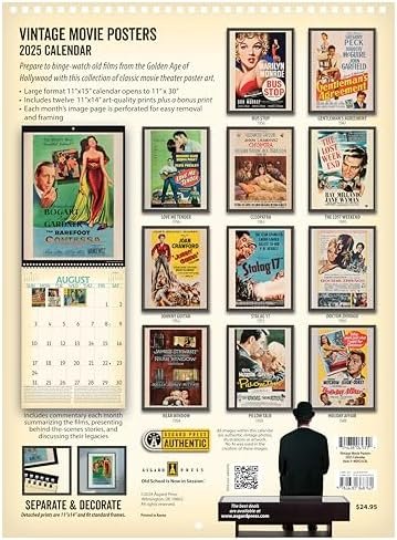 Grab your popcorn and prepare to binge-watch old movies each month with the Asgard Press 2025 Vintage Movie Posters Calendar, a collection of faithfully reproduced vintage movie posters from the 1940’s – 1960’s. These classic posters showcase the cinematic entertainment of an earlier era, complete with all the glitz and glamour of the big stars on the big screen. Movie posters from this era epitomized the art of visual storytelling, enticing audiences with their striking and evocative designs. These posters often featured bold and vibrant illustrations that captured the essence of the films, from the glamour of the Golden Age of Hollywood to the suspense of film noir and the excitement of adventure and romance. With their iconic images, memorable taglines, and skillful composition, these movie posters became iconic works of art that continue to captivate collectors and enthusiasts today. Each month features a classic movie poster of a memorable Hollywood film, accompanied by expanded commentary detailing the story behind each film. With its large vertical format of 11×15 inches, our wire-bound wall calendar opens to an impressive 11×30 inches. The perforated design allows for easy removal of each month’s image, making them a perfect fit for standard 11×14 inch frames. Generously sized grid spaces leave plenty of room to keep track of all your appointments, reminders, and events. Add a touch of old Hollywood glamor to your home or office space with this calendar of cinematic poster art, while organizing all your important dates in a visually memorable way.