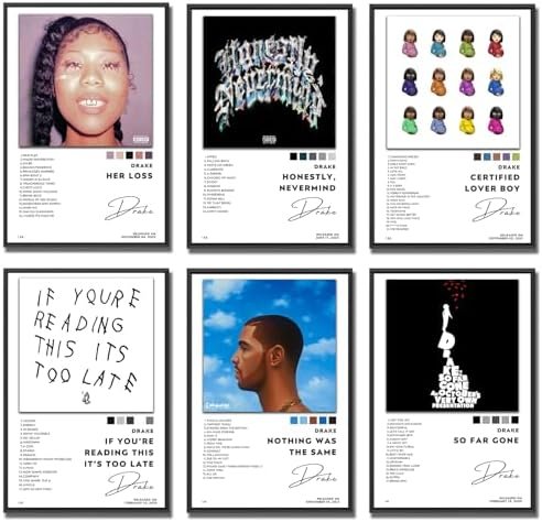 Iconic Drake Album Covers: Elevate your bedroom decor with a set of 6 iconic album covers from Drake’s discography. Each poster showcases a different album cover, allowing you to create a stylish and dynamic display on your bedroom wall.
