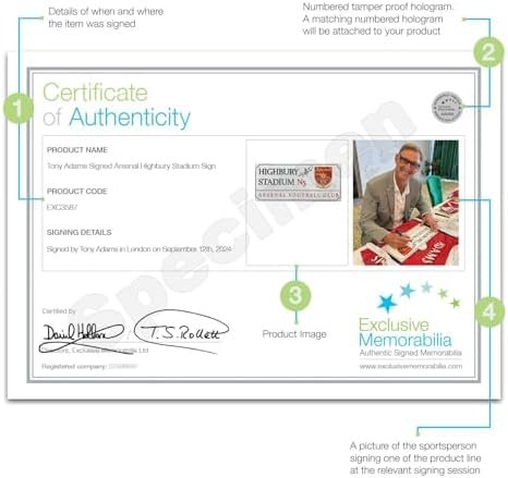 This Highbury stadium sign was signed by Tony Adams on September 12, 2024 in London. A true one club legend, Adams spent his entire career of 19 seasons playing for Arsenal. He is still considered one of the greatest Arsenal players of all time by fans. Adams won 10 major trophies at the London club, including league titles in three different decades.
