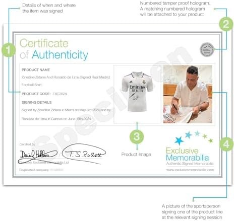 This Real Madrid soccer jersey was personally signed by Zinedine Zidane in on May 3, 2024 in Miami and Ronaldo Luís Nazário de Lima in Cannes on June 19, 2024. Ronaldo scored 104 goals in 177 games for Real Madrid between 2002-2007. He helped the win La Liga during his first season with the club and won his second Ballon d’Or award. Zizou made over 155 appearances for Madrid between 2001-2006. Zidane won 6 major titles with Real Madrid as a player and added a further 11 trophies as a manager.